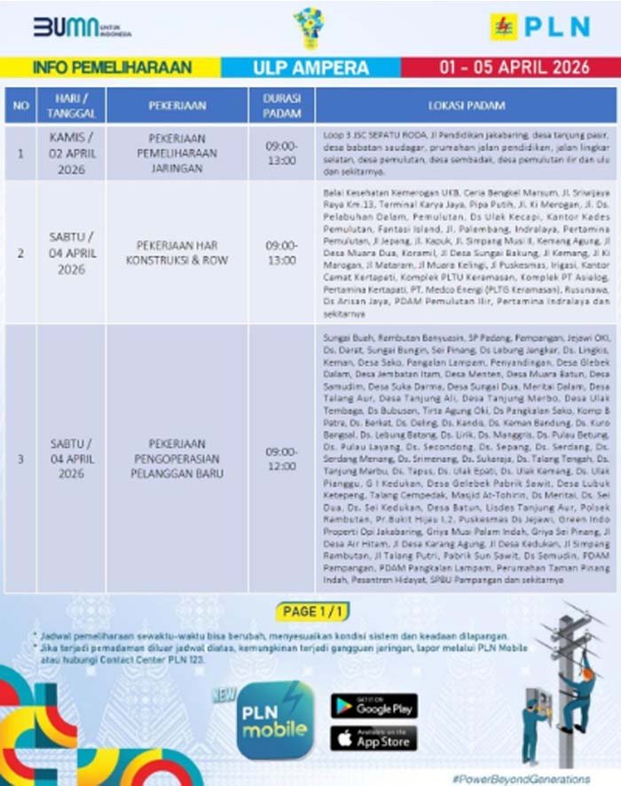 PALEMBANG, BERITAANDA – PT PLN (Persero) Unit Layanan Pelanggan (ULP) Ampera akan melaksanakan pemeliharaan jaringan listrik pada 2 hingga 4 April 2026. Kegiatan ini berpotensi menyebabkan pemadaman listrik terjadwal disejumlah wilayah di Palembang dan Ogan Ilir.