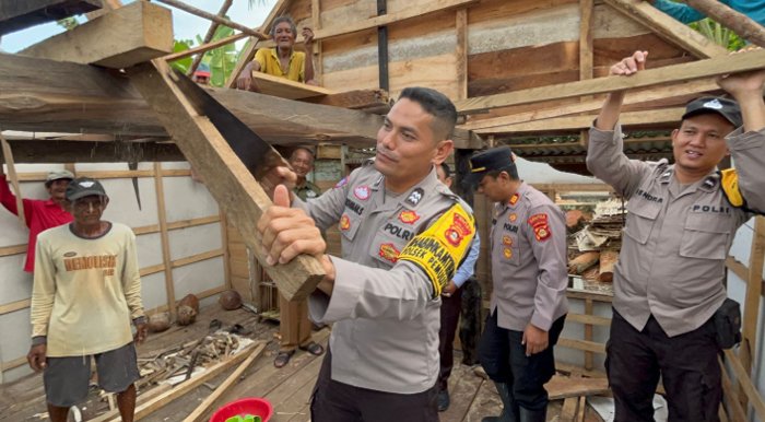 Tidak hanya menyalurkan bantuan, personel kepolisian bersama warga setempat juga melaksanakan gotong royong memperbaiki atap rumah korban pada hari yang sama. Upaya ini dilakukan untuk mempercepat pemulihan kondisi rumah agar kembali layak huni serta memberikan rasa aman dan nyaman bagi korban.