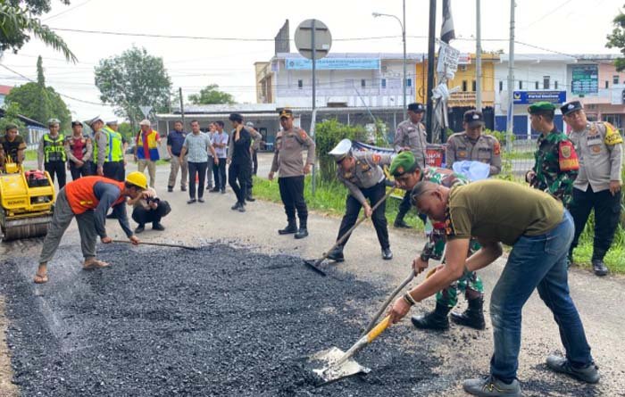 Polres OKI Bersihkan Lingkungan dan Tambal Jalan, Dukung Program BELIDA Kapolda Sumsel