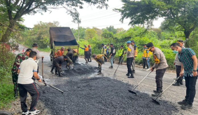 Polres OKU Tambal Jalan Berlubang di Jalur Lintas Sumatera Jelang Mudik Lebaran