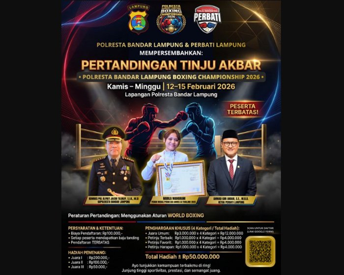 BANDAR LAMPUNG, BERITAANDA – Polresta Bandar Lampung bekerja sama dengan Persatuan Tinju Amatir Indonesia (Perbati) Lampung akan menggelar kejuaraan tinju bertajuk ‘Polresta Bandar Lampung Championship 2026’.