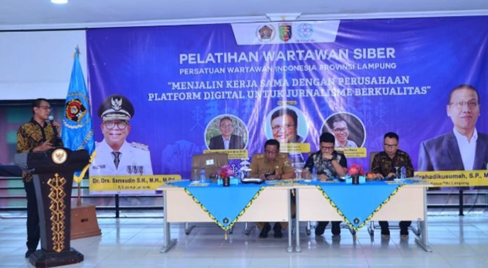 BANDAR LAMPUNG, BERITAANDA – PWI Lampung menggelar pelatihan wartawan siber tentang perpres publisher right, dibuka oleh Staf Ahli Gubernur Bidang Pemerintahan, Hukum dan Politik Ganjar Jationo, Selasa (15/10/2024).