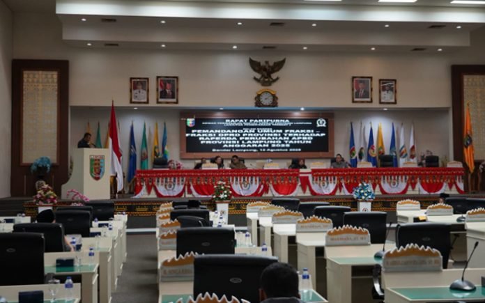 BANDAR LAMPUNG, BERITAANDA – Sekretaris Daerah Provinsi Lampung, Marindo Kurniawan, menghadiri rapat paripurna DPRD Provinsi Lampung lanjutan pembicaraan tingkat I terkait pemandangan umum Fraksi-Fraksi terhadap Raperda Perubahan APBD tahun anggaran 2025, Selasa (12/8/2025).
