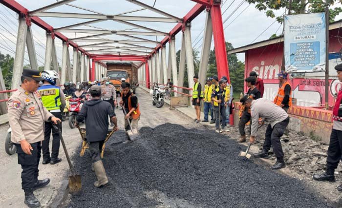 Kapolres OKU bersama jajaran pejabat utama serta unsur Balai Besar Jalan Nasional dan Dinas Lingkungan Hidup melaksanakan penambalan jalan berlubang sekaligus pembersihan sampah di sepanjang ruas jalan lintas Sumatera tersebut.