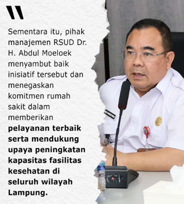 Direktur RSUD Dr. H. Abdul Moeloek, dr. Imam Ghozali, menyambut baik kerja sama tersebut dan menegaskan komitmen rumah sakit dalam mendukung pelayanan kesehatan di seluruh wilayah Lampung.