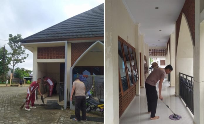 Kegiatan diawali dengan membersihkan bagian dalam masjid dan pekarangan luar masjid.