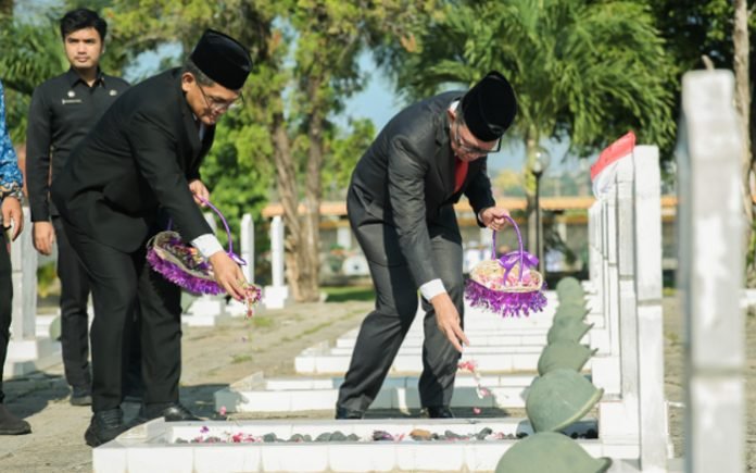 BANDAR LAMPUNG, BERITAANDA – Sekretaris Daerah Provinsi (Sekdaprov) Lampung Fahrizal Darminto bertindak sebagai inspektur upacara pada ziarah makam dan tabur bunga, dalam rangka HUT Provinsi Lampung ke-60 di Taman Makam Pahlawan Nasional Provinsi Lampung, Selasa (19/3/2024).