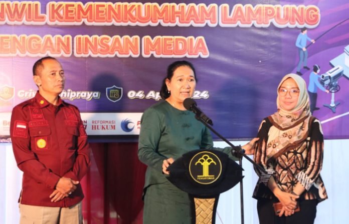 BANDAR LAMPUNG, BERITAANDA – Kepala Kantor Wilayah Kementerian Hukum dan HAM Lampung Dr. Sorta Delima Lumban Tobing bertemu dengan rekan wartawan dari berbagai media yang bertugas di wilayah Bandar Lampung, dalam rangka silaturahmi dan berbuka puasa bersama di Griya Abhipraya Bersinar, Kamis (4/4/2024).