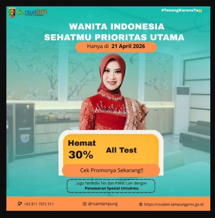 Sebagai bentuk kepedulian terhadap kesehatan wanita, RSUDAM memberikan promo spesial berupa diskon 30 persen untuk seluruh jenis pemeriksaan (All Test) yang berlaku khusus pada 21 April 2026.