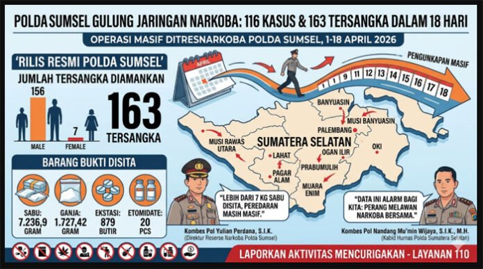PALEMBANG, BERITAANDA – Polda Sumatera Selatan menegaskan komitmennya sebagai garda terdepan dalam menjaga stabilitas keamanan nasional melalui operasi pemberantasan narkotika yang masif, terukur, dan berkelanjutan. Dalam kurun waktu 18 hari pertama April 2026, Direktorat Reserse Narkoba bersama jajaran satuan wilayah berhasil mengungkap 116 laporan polisi dengan total 163 tersangka.