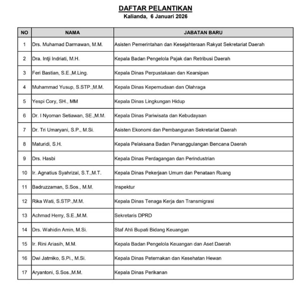 Pelantikan ini merupakan bagian dari penataan dan pengisian jabatan hasil uji kompetensi pejabat pimpinan tinggi pratama yang telah dilaksanakan sebelumnya. Langkah tersebut dilakukan sebagai upaya penyegaran organisasi sekaligus penguatan kinerja pemerintahan daerah.