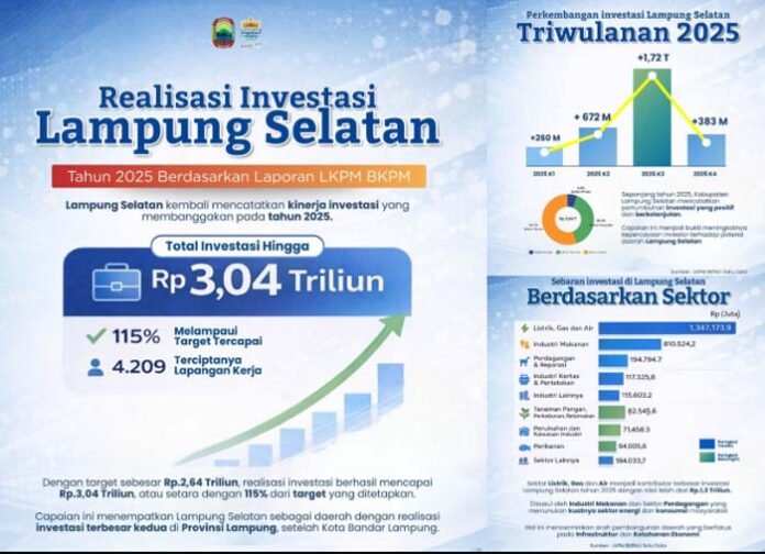 LAMPUNG SELATAN, BERITAANDA – Realisasi investasi di Kabupaten Lampung Selatan sepanjang 2025 melampaui target yang ditetapkan pemerintah daerah. Hingga akhir triwulan IV 2025, nilai investasi tercatat mencapai Rp3,040 triliun atau 115 persen dari target Rp2,64 triliun.