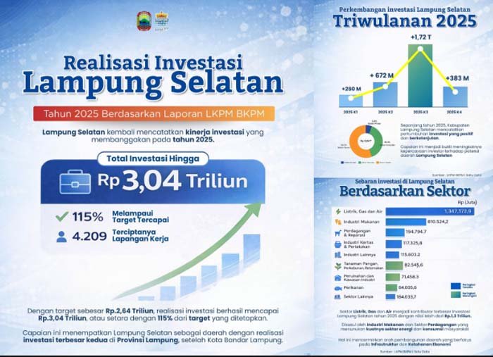 Berdasarkan data Kementerian Investasi dan Hilirisasi/BKPM yang dilansir melalui laman resmi, target investasi Lampung Selatan tahun 2025 sebesar Rp2,64 triliun berhasil dilampaui dengan realisasi Rp3,040 triliun.