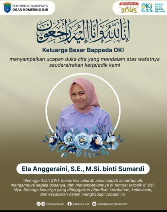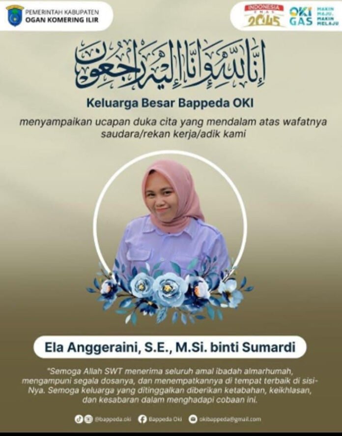 OGAN KOMERING ILIR, BERITAANDA – Duka mendalam menyelimuti jajaran Pemerintah Kabupaten Ogan Komering Ilir (Pemkab OKI) serta masyarakat luas. Seorang pegawai Badan Perencanaan Pembangunan Daerah (Bappeda) OKI, Ela Anggraeni SE M.Si, meninggal dunia akibat kecelakaan lalu lintas yang terjadi pada Senin (9/2/2026) pagi.