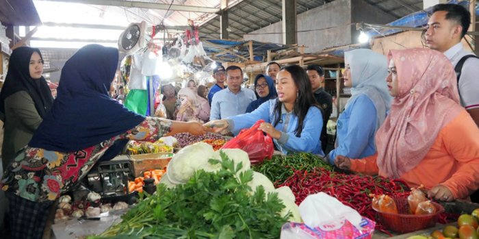 Sejak tiba, Zita menyapa pedagang satu per satu. Ia berdialog ringan, menanyakan harga beras, minyak goreng, gula pasir, telur, daging, buah, hingga sayuran lokal.