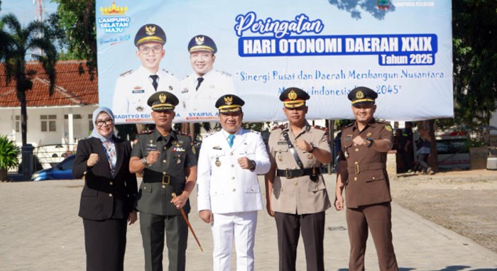 LAMPUNG SELATAN, BERITAANDA – Pemerintah Kabupaten (Pemkab) Lampung Selatan menggelar upacara peringatan Hari Otonomi Daerah (Otda) ke-XXIX tahun 2025 yang berlangsung di Lapangan Korpri, Kalianda, kompleks kantor pemkab setempat, Jumat (25/4/2025).